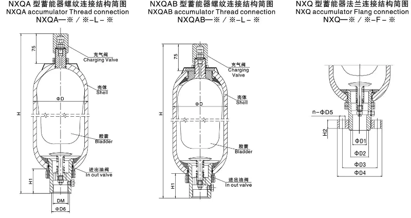 The standard bladder accumulator is: NXQA-40/31.5-F-Y. The design pressure is 31.5Mpa, the nominal volume is 40L,